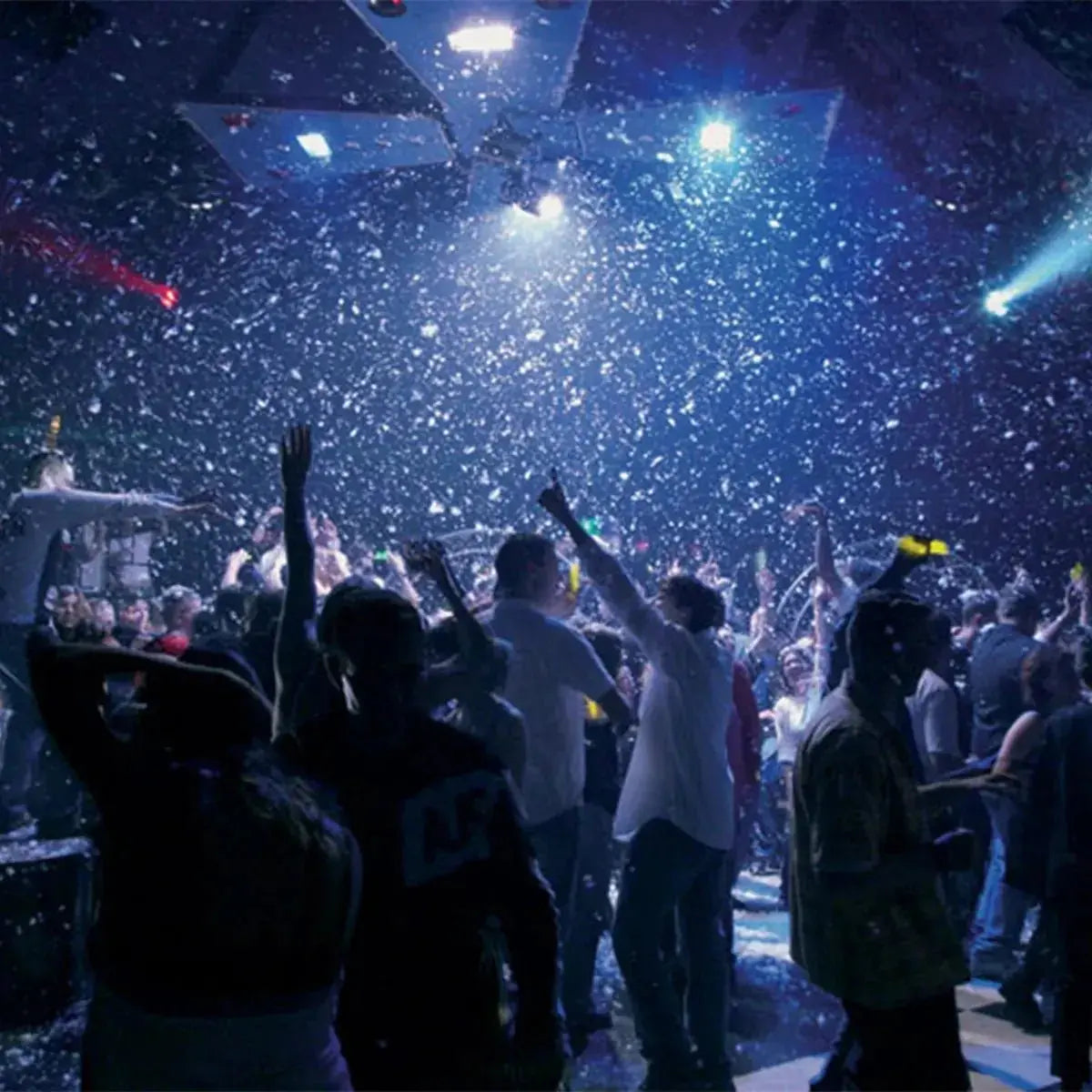 The Arctic Flake covers approximately 540–650 square feet per minute (50–60 m²) — enough to fill a medium-to-large room, stage area, dance floor, or outdoor zone with visible snowfall. For larger spaces, use multiple units spaced across the coverage area.