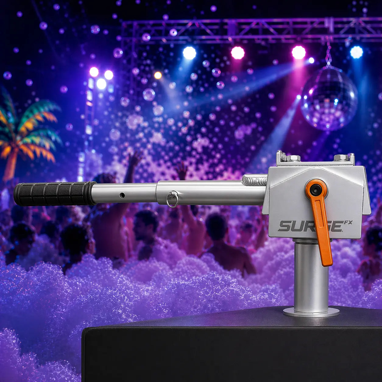 During setup, mount the foam machine, extend the stand to your desired height, and use the 360° rotation to aim the foam output directly at your target zone. Lock it in place and do a test run before the crowd arrives.