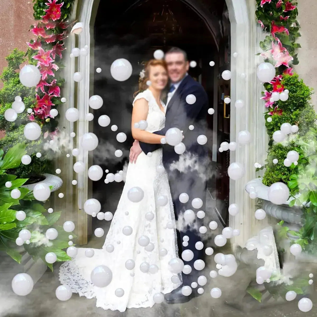 - Fog-Filled Bubbles — The signature effect. The machine traps dense fog inside each bubble, creating translucent orbs that drift through the air filled with swirling smoke. When they pop — on contact with a hand, a shoulder, the floor — they release a small burst of fog that curls and dissipates. It's a visual effect that stops people in their tracks. Under the RGBW LEDs, fog-filled bubbles glow with color as they float, creating a surreal, otherworldly atmosphere.